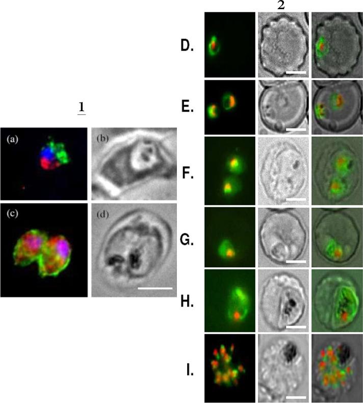 1. BFA-treated (a) and control parasites in presence of ethanol (c) were analysed by immunofluorescence by using anti-MAP1 antibodies to detect PfA-M1 (red) and a mouse anti-exp2 serum as positive control (green). Nuclei, stained by using Hoechst 33342 appear in blue Corresponding phase contrasts are in (b, d). Scale bar, 5μm. In the control exp-2 was targeted as expected to the PVM and PfA-M1 was diffuse in the parasite (but outside the FV)2. Live imaging of FcB1 parasites transfected with a construct allowing expression of PfA-M1-GFP chimera confirm its marginal association with the food vacuole. Live imaging of transfected parasites showing: D, E. ring stages. F, G, trophozoite stages; H. young schizont. I. segmenting schizont. First column: GFP (green) and nuclei (Hoechst 33342); second column: phase contrast; third column: overlay. Scale bar, 5μm.Azimzadeh O, Sow C, Geze M, Nyalwidhe J, Florent I. Plasmodium falciparum PfA-M1 aminopeptidase is trafficked via the parasitophorous vacuole and marginally delivered to the food vacuole. Malar J. 2010 9:189:9
