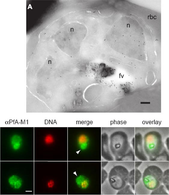 Upper: Immunofluorescence localization of PfA-M1 in parasites fixed with 50% methanol/50% ethanol at -20 °C. Anti-PfA-M1 fluorescence is pseudocolored green and DAPI fluorescence (DNA) is pseudocolored red. Food vacuole fluorescence is identified by co-localization with the hemozoin crystal and is indicated with an arrowhead in the “merge” image. Panel B clearly shows PfA-M1 label in the food vacuole, whereas a nuclear localization is more evident in panel C. Scale bar, 1 μm.Lower: Localization of PfA-M1 in intraerythrocytic P. falciparum. A, PfA-M1 was detected in a parasite cryosection with affinity-purified anti-PfA-M1 antibodies. PfA-M1 is present throughout the lumen of the food vacuole and in the nucleus. fv, food vacuole; n, nucleus; rbc, red blood cell. Scale bar, 250 nmRagheb D, Dalal S, Bompiani KM, Ray WK, Klemba M. Distribution and Biochemical Properties of an M1-family aminopeptidase in Plasmodium falciparum indicate a role in vacuolar hemoglobin catabolism. J Biol Chem. 2011 286:27255-65