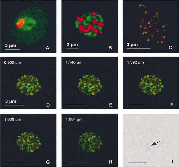 PfA-M1 subcellular location. Samples from Plasmodium falciparum in vitro cultures at various stages were fixed in a mix of methanol and acetone (1:4) and the fuorescence associated with the anti-MAP1 Igs (10 mg/ml, green) and with the nuclei (red) was observed by confocal microscopy. (A) Trophozoite. (B) Schizont. (C) Released merozoites. (D-H) Series of 5 optical sections through a mature schizont (positions along the z axis indicated on the upper left of each panel). (I) Corresponding phase-contrast image, showing the digestive vacuole (indicated by an arrow). In trophozoites, the labelling was diffuse in the parasite cytoplasm, with accumulations around the food vacuole. In schizonts, it turned progressively to a vesicle-like pattern, ending as a clear spot in released merozoites.Allary M, Schrevel J, Florent I. Properties, stage-dependent expression and localization of Plasmodium falciparum M1 family zinc-aminopeptidase. Parasitology. 2002 125:1-10. Copyright Cambridge University Press.