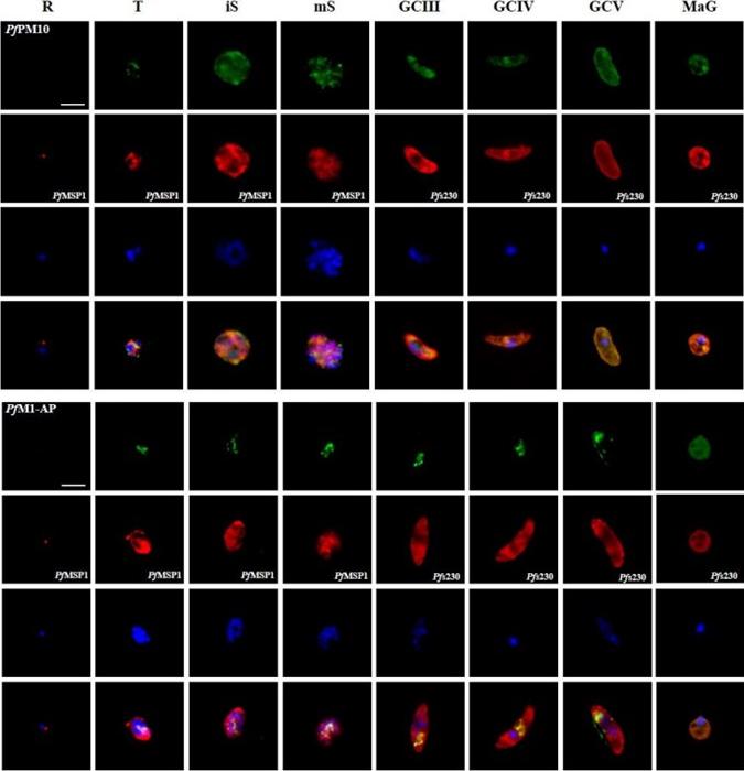 Protein expression profile of selected P. falciparum proteases. IFAs using polyclonal mouse antisera directed against 12 of the proteases was used to demonstrate protein expression in the asexual blood stages (R, ring; T, trophozoite; iS, immature schizont; mS, mature schizont) and gametocytes (GC stages III, IV and V) as well as in macrogametes (MaG) at 20 min post-activation (in green). The asexual and the sexual blood sstages were visualized via immunolabelling with polyclonal rabbit antisera against PfMSP1 and Pfs230, respectively (in red). Hoechst 33342 staining was used to highlight the parasite nuclei (in blue). Bar, 5 μm. Results are representative of three to four independent experiments.Weißbach T, Golzmann A, Bennink S, Pradel G, Julius Ngwa C. Transcript and protein expression analysis of proteases in the blood stages of Plasmodium falciparum. Exp Parasitol. 2017 Mar 25. [Epub ahead of print]