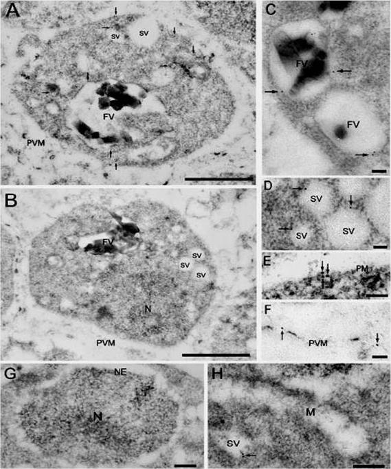 Localization of V-ATPase subunit A. A and B show the whole body of the parasite immunostained with anti-V-ATPase subunit A antibodies (A) or control IgG (B); C, parts of food vacuoles (FV); D, small clear vesicles (SV); E, plasma membrane (PM); F, parasitophorus vacuolar membrane (PVM); G, nucleus (N) and nuclear envelope (NE); H, mitochondrion (M); Immunogold for V-ATPase subunit A selectively labeled food vacuoles (A and C), small clear vesicles (A and D), and the plasma membrane (A and E). Immunogold particles were also occasionally observed in the parasitophorus vacuolar membrane (F),Hayashi M, Yamada H, Mitamura T, Horii T, Yamamoto A, Moriyama Y. Vacuolar H+-ATPase localized in plasma membranes of malaria parasite cells, Plasmodium falciparum, is involved in regional acidification of parasitized erythrocytes. J Biol Chem. 2000 275:34353-8.