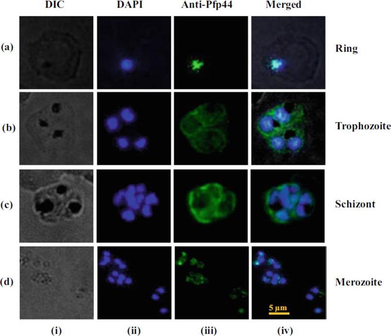 localization of p44 in P. falciparum 3D7 strain. A Different stages, i.e., ring, trophozoites, schizonts, and merozoites of the P. falciparum 3D7 strain, were fixed and stained with purified anti-Pfp44 antibody. Bright field image (i), image of cell stained with DAPI (ii), Immunof-luorescently stained cell with anti-Pfp44 antibodies (iii), and merged images (iv). Pfp44 is present mostly in nucleus in the merozoite and ring stages (a and d) but in trophozoite and schizont stages, the localization spreads to cytoplasm also (b–c). Tajedin L, Tarique M, Tuteja R. Plasmodium falciparum XPD translocates in 5'to 3' direction, is expressed throughout the blood stages, and interacts with p44. Protoplasma. 2015 Feb 24. [Epub ahead of print]