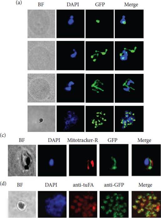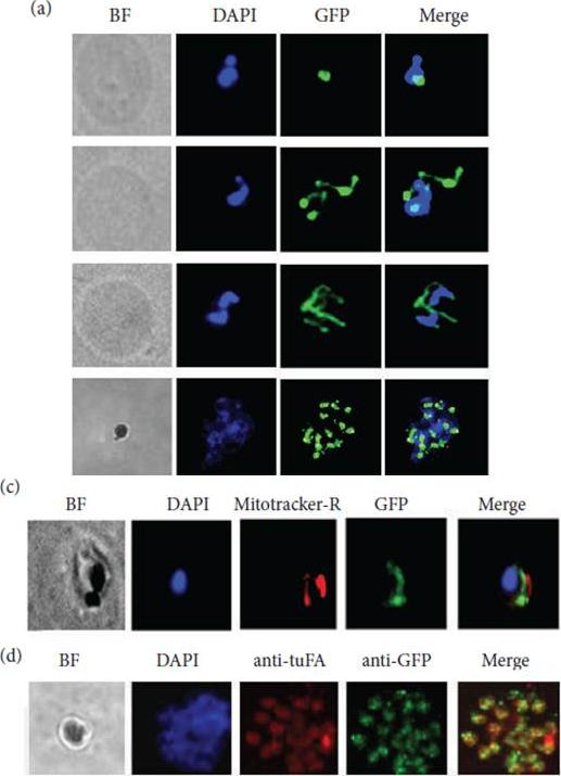 (a) Immunofluorescence microscopy done (anti-GFP) on parasites episomally expressing MAL13P1.156-GFP fusion shows typical apicoplast pattern. (b) Antibody against the c-terminal GFP detects MAL13P1.156 full-length protein with an apicoplast targeted protein signature (T-transfected, C-Control). (c, d) Colocalisation with Mitotracker-Red and apicoplast encoded tuF, respectively.Cheemadan S, Ramadoss R, Bozdech Z. Role of calcium signaling in the transcriptional regulation of the apicoplast genome of Plasmodium falciparum. Biomed Res Int. 2014;2014:869401