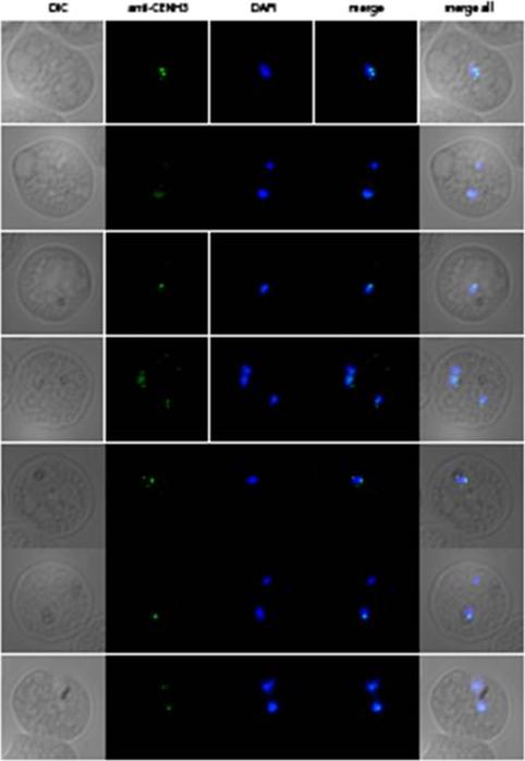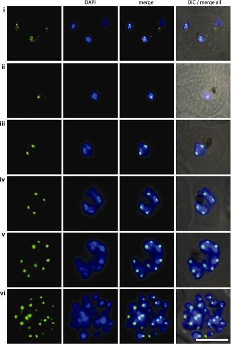 Double staining immunofluorescence pictures obtained from the transgenic parasite line 3D7/HP1-HA expressing HA-tagged PfHP1. Cells were simultaneously probed with aHA and aPfCENH3 antibodies. PfCENH3 foci do not overlap with PfHP1-marked chromosome end clusters. GFP live fluorescence and aPfCENH3 6 antibody (green), aHA antibody (red), DAPI nuclear stain (blue), DIC (differential interference contrast). Scale bars are 5 μm long.Hoeijmakers WA, Flueck C, Françoijs KJ, Smits AH, Wetzel J, Volz JC, Cowman AF, Voss T, Stunnenberg HG, Bártfai R. Plasmodium falciparum centromeres display a unique epigenetic makeup and cluster prior to and during schizogony. Cell Microbiol. 2012 14(9):1391-401.