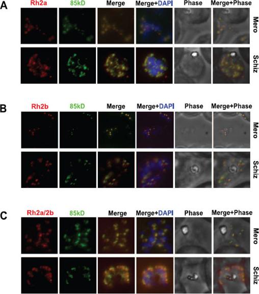 The 85 kDa processed form of PfRh2a and PfRh2b colocalises with the corresponding C-terminal regions in both merozoite and schizont stages. (A) The 85 kDa product co-localises with the C-terminal PfRh2a product. Free merozoites or schizonts of the 3D7 parasite were dual stained with 8F9 anti-PfRh2a and R1170 anti-85 kDa antibodies. Both merozoites and schizonts give an apical staining pattern with both antibodies, indicating co-localisation. Nuclei were stained with DAPI. (B) The 85 kDa product co-localises with the C-terminal PfRh2b product. Parasites were dual stained with 4B7 anti-PfRh2b and R1170 anti-85 kDa antibodies. As for (A), both antibodies give a co-localised apical staining pattern. (C) The 85 kDa product co-localises with both the PfRh2a and PfRh2b C-terminal products. Parasites were dual stained with 3A2 anti-PfRh2a/2b and R1170 anti-85 kDa antibodies. As for (A), both antibodies give a co-localised apical staining pattern.Triglia T, Chen L, Lopaticki S, Dekiwadia C, Riglar DT, Hodder AN, Ralph SA, Baum J, Cowman AF. Plasmodium falciparum merozoite invasion is inhibited by antibodies that target the PfRh2a and b binding domains. PLoS Pathog. 2011 Jun;7(6):e1002075.