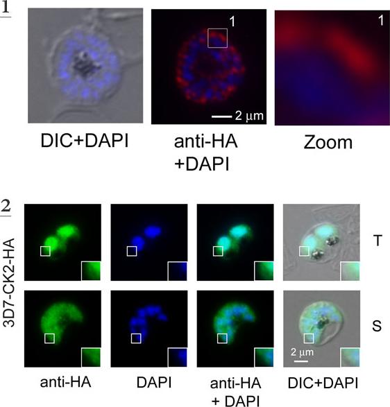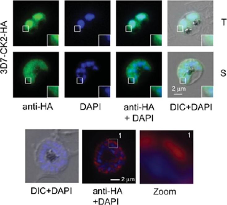 Upper pannel: Immunofluorescence microscopy using endogenously derived Pf CK2α–HA. Localization with the anti-HA antibodies (green) confirmedexpression in the nucleus (blue, DAPI) and cytosol of fixed parasites in the trophozoite (T) and schizont (S) stage. Scale bar indicates 2 μm. Enlargements of selected areas are marked with a white square. DIC, differential interference contrast microscopy. PF3D7_1108400. The endogenously tagged protein was localized in the parasite’s cytosol, as well as in the nucleus of trophozoite stage parasites. In the schizont stage of the parasite the dual localization ofendogenously tagged CK2 was less pronounced and appeared predominantly cytosolic. Lowe pannel: Expression of Rh2b–HA was verified by IFA using anti-HA antibodies. Scale bar, 2 μm. DIC, differential interference contrast microscopy. Rh2b–HA is localized at the apical pole of nascent merozoites.Engelberg K, Paul AS, Prinz B, Kono M, Ching W, Heincke D, Dobner T, Spielmann T, Duraisingh MT, Gilberger TW. Specific phosphorylation of the PfRh2b invasion ligand of Plasmodium falciparum. Biochem J. 2013 Jun 15;452(3):457-66.