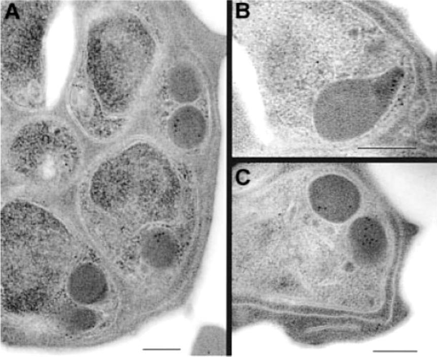 Subcellular localization of PfRh2a/b in 3D7 parasites by immunoelectron microscopy. (A-C) Cross-sections through merozoites. Scale bars are 200 nm in all panels. Immunoelectron microscopy with anti-PfRh2a/b antibodies showed labeling in the electron-dense rhoptry organelles of the parasite (A and C), with label evident in the neck of the rhoptry in some parasites (B).Duraisingh MT, Triglia T, Ralph SA, Rayner JC, Barnwell JW, McFadden GI, Cowman AF. Phenotypic variation of Plasmodium falciparum merozoite proteins directs receptor targeting for invasion of human erythrocytes. EMBO J. 2003 22:1047-57.