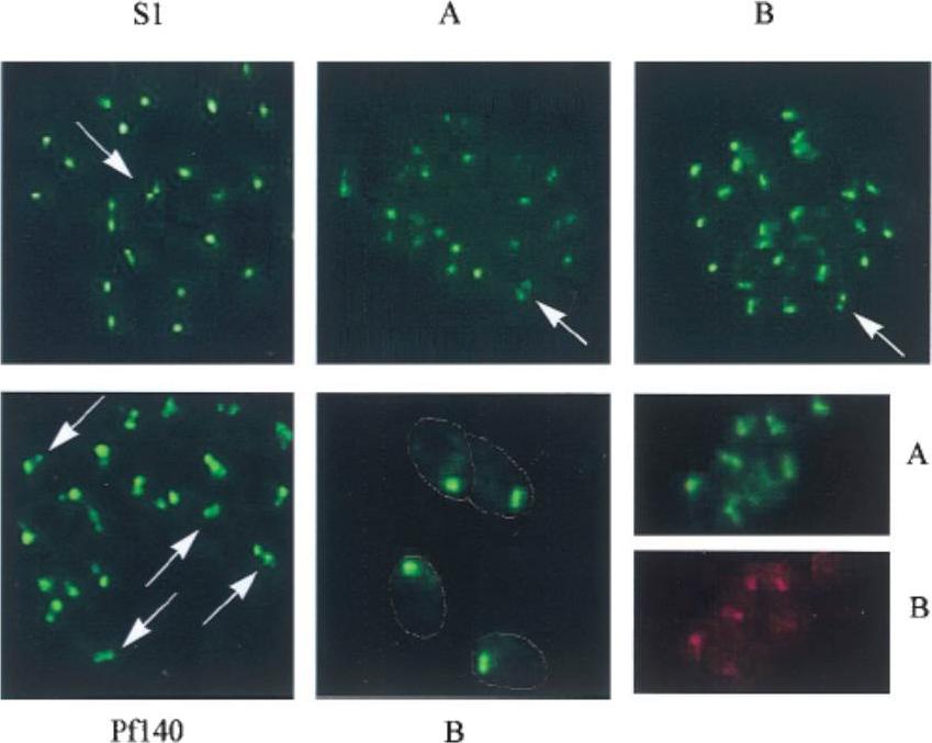Immunofluorescence assays performed with antisera against fragments of the shared domain (S1), fragments of the unique regions, anti-PfRBP2-Ha (A) and anti-PfRBP2-Hb (B), and the rhoptry antigen Pf-140, on air-dried, acetone-fixed, P. falciparum-infected erythrocytes. The lower center panel (B) is at a higher magnification (33,750; others are 31,250), with the outline of the merozoites marked. The lower right shows costaining of single merozoites with rabbit anti-A serum (A) and rat anti-B serum (B). Each of the PfRBP2-H antisera, whether raised against fragments of the shared domain, anti-S1 and anti-S3, or against the unique regions, anti-A and anti-B, yielded a punctate staining pattern, generally with a single dot of fluorescence, although occasionally two foci were visible in a single merozoite (marked by arrows Upper). This double-dot pattern is reminiscent of proteins such as the Pf140 protein, which are localized to the paired rhoptry organelles. Higher magnification (Lower Center) reveals that the staining is concentrated at the apical end of the merozoites.Rayner JC, Galinski MR, Ingravallo P, Barnwell JW. Two Plasmodium falciparum genes express merozoite proteins that are related to Plasmodium vivax and Plasmodium yoelii adhesive proteins involved in host cell selection and invasion. Proc Natl Acad Sci U S A. 2000 97:9648-53. Copyright 2009 National Academy of Sciences, U.S.A.