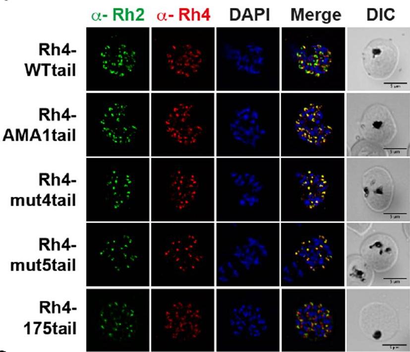 Specific amino acid residues in the cytoplasmic domain are essential for PfRh4 function. Localization of PfRh4 and PfRh2 in Rh4-WT tail, RH4-AMA1 tail (PfRh4 tail was replaced with the cytoplasmic sequence of AMA1), Rh4-mut4tail ) contains the mutations S1667A, S1674A, Y1680A and Y1684A) and RH4-mut5tail (contains similar mutations with an addition mutation at S1652A within the PfRh4 cytoplasmic tail) lines as detected using anti-PfRh4 monoclonal and anti-PfRh2 polyclonal antibodies. Parasite nuclei were stained with DAPI. Rh4-mut4 tail and Rh4-mut5 tail expressed PfRh4 and all showed an apical localization similar to rhoptry protein PfRh2Tham WH, Lim NT, Weiss GE, Lopaticki S, Ansell BR, Bird M, Lucet I, Dorin-Semblat D, Doerig C, Gilson PR, Crabb BS, Cowman AF. Plasmodium falciparum Adhesins Play an Essential Role in Signalling and Activation of Invasion into Human Erythrocytes. PLoS Pathog. 2015 Dec 22;11(12):e1005343.