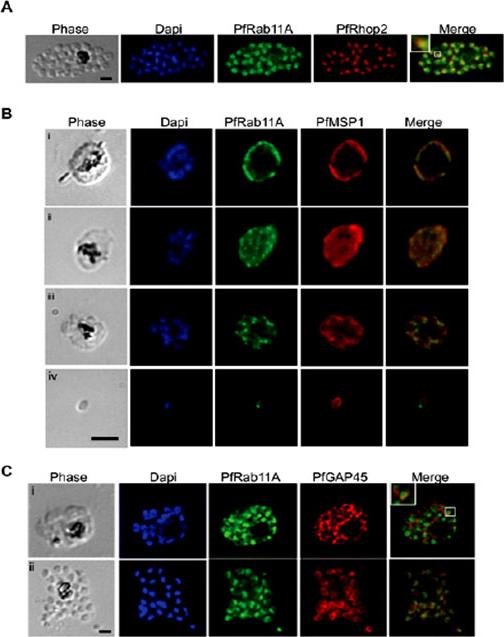 PfRab11A has a dynamic localisation. (A–C) Throughout the erythrocytic stage of parasite development the localisation of PfRab11A changes. (A) Rhoptry localisation was confirmed in mature schizonts by immuno-staining infected blood smears with anti-PfRab11A and colocalisation (enlargement shown boxed in merge) demonstrated with anti-PfRhopH2 PFI1445w (rhoptry specific marker) antibodies. The bright-field image shows a mature schizont with the nuclei stained with Dapi. (B) PfRab11A co-localises partially with PfMSP1 PFI1475w (plasma membrane specific marker) in trophozoites (i, ii) and schizonts (iii). The merged images show co-localisation of the two proteins, giving single dots. In merozoites (iv), the localisation of PfMSP1 and PfRab11A is now distinct with PfRab11A having an apical localisation slightly under the plasma membrane decorated by PfMSP1. (C) The first two panels show the bright-field (phase) and Dapi, respectively. The last panel in all images shows an overlay. In young (i) and segmented (ii) schizonts, PfRab11A partially co-localises with PfGAP45 PFL1090w (Glidosome Associated Protein 45 used as an Inner Membrane Complex specific marker). Bar 5 mm.Agop-Nersesian C, Naissant B, Ben Rached F, Rauch M, Kretzschmar A, Thiberge S, Menard R, Ferguson DJ, Meissner M, Langsley G. Rab11A-controlled assembly of the inner membrane complex is required for completion of apicomplexan cytokinesis. PLoS Pathog. 2009 5(1):e1000270.