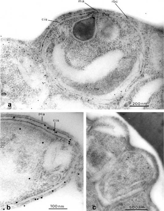 Immuno-electron microscopy, showing distribution of Pf-myo1 in the malaria parasite. (a) Immunogold-labelled merozoites before their release from the red cell. The parasite was labelled with anti-Pf-myo1 and second antibody, conjugated with 10 nm gold particles. The myosin is located around the periphery of the merozoite. In the centre the merozoite plasma membrane overlies the apical prominence (ma) close to the large pearshaped secretory rhoptry, and elsewhere in the parasite a flat cisterna (cis) underlies the plasma membrane. The curved nucleus (nu) is visible at the base of the merozoite. Note absence of label from the flat tip of the apical prominence, and the greater frequency of labelling around the apical prominence than elsewhere. (b) Longitudinal/oblique section through the apical end of a free merozoite. Labelling is associated with the cortical cytoplasm between the plasma membrane (pla) and the outer membrane of the subplasmalemmal cisterna (cis). (c) Control section through a group of mature merozoites at the periphery of a late-stage schizont, incubated with preimmune serum before gold labelling. No significant labelling can be observed.Adapted with permission from Pinder JC, Fowler RE, Dluzewski AR, Bannister LH, Lavin FM, Mitchell GH, Wilson RJ, Gratzer WB. Actomyosin motor in the merozoite of the malaria parasite, Plasmodium falciparum: implications for red cell invasion. J Cell Sci. 1998 111:1831-9.
