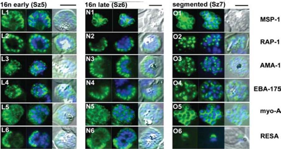 The appearance of Plasmodium falciparum schizonts of the ITO4 line at different times of development. The time of sampling from invasion and the number of nuclei per schizont are indicated. Antibodies to proteins associated with invasion related organelles or the parasite periphery (rhoptries : RAP-1; micronemes: AMA-1, EBA-175; dense granules: RESA; parasite periphery: MSP-1, myo-A) were chosen to follow the development and assembly of merozoites in maturing schizonts.Margos G, Bannister LH, Dluzewski AR, Hopkins J, Williams IT, Mitchell GH. Correlation of structural development and differential expression of invasion-related molecules in schizonts of Plasmodium falciparum. Parasitology. 2004 129:273-87. Copyright Cambridge University Press Journals 2011