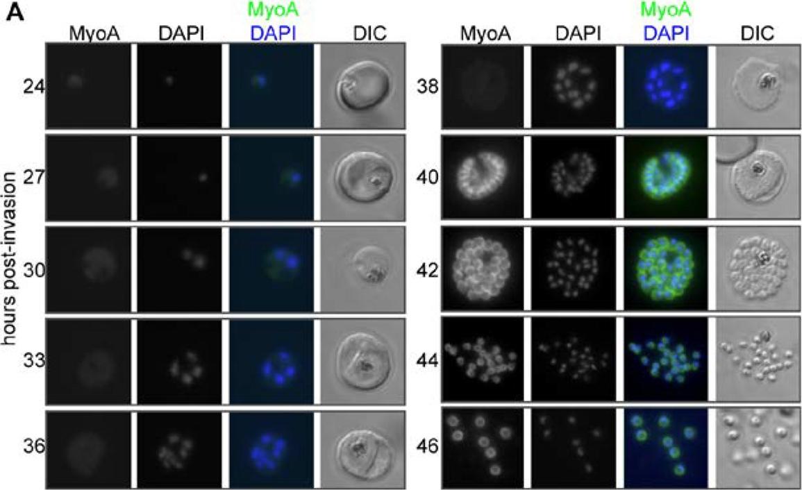 MyoA-GFP expression and glideosome complex formation during the late stages of intracellular development of P. falciparum in the red blood cell. (A) MyoA-GFP expression was detected by live fluorescence microscopy and the nuclei were detected by staining with DAPI. The merged colour image with MyoA-GFP (green) and DAPI (blue) and differential interference contrast (DIC) bright field images are also shown. Schizogony starts at around 30 hours post-invasion and MyoA-GFP is detected from 38–40 hours in multinucleated forms. Scale bar: 2 µm. MyoA-GFP was largely undetectable by live fluorescence microscopy until approximately 38 hours after merozoite invasion of an erythrocyte, but was present in later stages at the periphery of developing segmented schizonts and free merozoites (but not associated with the food vacuole/residual body), consistent with its proposed location at the IMC (Fig. 2A). No GFP signal was detected in ring or trophozoite stages indicating that the protein is not synthesised at this time and any MyoA carried through with the invading merozoite is degraded rapidly following erythrocyte invasion.Green JL, Wall RJ, Vahokoski J, Yusuf NA, Ridzuan MAM, Stanway RR, Stock J, Knuepfer E, Brady D, Martin SR, Howell SA, Pires IP, Moon RW, Molloy JE, Kursula I, Tewari R, Holder AA. Compositional and expression analyses of the glideosome during the Plasmodium life cycle reveal an additional myosin light chain required for maximum motility. J Biol Chem. 2017 Sep 11.