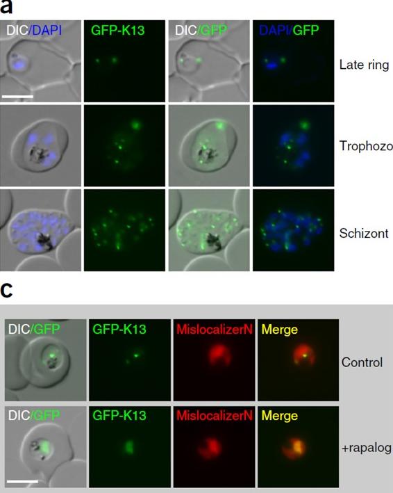 Analysis of the artemisinin-resistance proteins Kelch13. (a) Localization of native N-terminally GFP-tagged Kelch13 (GFP-2×FKBP-Kelch13). The endogenously expressed GFP-2×FKBP-Kelch13 was located in foci in the parasite cytoplasm (a). At least one of these foci was usually close to the parasite food vacuole. (c) KS with the 2×FKBP-GFP-2×FKBP-Kelch13 parasite line. Left, fluorescence microscopy images of live cells, showing the KS (rapalog) and control. KS with this cell line (Supplementary Figs. 1 and 9b) led to complete mislocalization of Kelch13 and to a rapid-growth phenotype.Birnbaum J, Flemming S, Reichard N, Soares AB, Mesén-Ramírez P, Jonscher E, Bergmann B, Spielmann T. A genetic system to study Plasmodium falciparum protein function. Nat Methods. 2017 Mar 13.