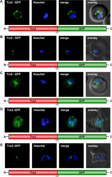 GFP targeting by thioredoxin 2 in various stages of P. falciparum. (A) Early ring stage parasite showing Trx2-GFP targeting to the PV. (B) Early trophozoite stage parasite showing two fluorescent Trx2-GFP points lying directly under the parasite plasma membrane. (C) Late trophozoite/early schizont stage parasite showing numerous fluorescent Trx2-GFP points. (D) Schizont stage parasite showing numerous fluorescent Trx2-GFP points. (E) Schizont stage parasite showing a small number of observable fluorescent Trx2-GFP structures. Live cell imaging of erythrocytes infected with transgenic parasites.Kehr S, Sturm N, Rahlfs S, Przyborski JM, Becker K. Compartmentation of redox metabolism in malaria parasites. PLoS Pathog. 2010 6:e1001242.