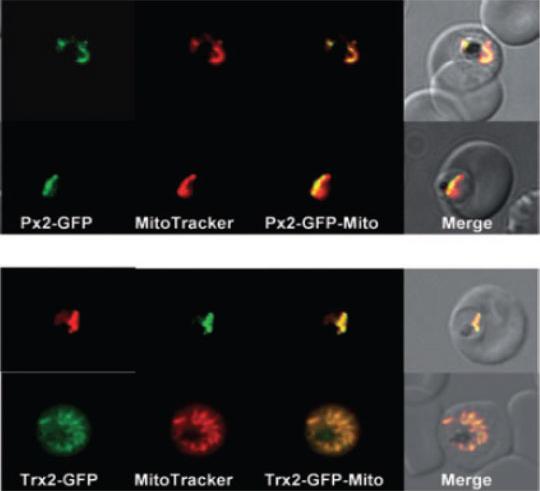 Localization of PfTrx-Px2 and PfTrx2 in P. falciparum erythrocytic stages. P. falciparum erythrocytic stages were transfected with construct pHH2-Px2-GFP, pHH2-Trx2-GFP leading to the expression of the peroxiredoxin or thioredoxin2 C-terminally fused to green fluorescent protein (GFP).A. The localization of the peroxiredoxin-GFP fusion protein in parasites previously treated with MitoTracker CMX-Ros was analysed by fluorescence light microscopy. Phase, phase contrast of parasitized erythrocytes infected with P. falciparum trophozoites; PfTrx-Px2-GFP, parasitized erythrocytes expressing the peroxiredoxin-GFP fusion protein analysed using the FITC channel; MitoTracker, parasitized erythrocytes expressing the peroxiredoxin-GFP fusion protein analysed using the rhodamine channel; PfTrx-Px2-Mito; merge of FITC and rhodamine channels; merge, merge of all images. The images show that the peroxiredoxin-GFP fusion protein is colocalizing with the mitochondrion (stained by MitoTracker).B. The expression of pHH2-PfTrx2 results in the localization of the fusion protein the mitochondrion. Phase, phase contrast of parasitized erythrocytes infected with P. falciparum trophozoites; PfTrx2-GFP, parasitized erythrocytes expressing the Trx2-GFP fusion protein analysed using the FITC channel; MitoTracker, parasitized erythrocytes expressing the Trx2-GFP fusion protein analysed using the rhodamine channel; PfTrx2-Mito; merge of FITC and rhodamine channels; merge, merge of all images.Boucher IW, McMillan PJ, Gabrielsen M, Akerman SE, Brannigan JA, Schnick C, Brzozowski AM, Wilkinson AJ, Müller S. Structural and biochemical characterization of a mitochondrial peroxiredoxin from Plasmodium falciparum. Mol Microbiol. 2006 61:948-59.PMID