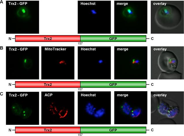 GFP targeting by P. falciparum thioredoxin 2. (A)–(C) Targeting of Trx2 to the parasitophorous vacuole and to a not yet characterized, non-dividing organelle within the parasite. Colocalization of GFP with the mitochondrial stain MitoTrackerOrange in fixed cells. Colocalization of GFP and the apicoplast marker ACP in fixed, immunodecorated cells. Trx2 is clearly localized in the parasitophorous vacuole. Trx2-GFP labeled further structures within the parasite (B, C) in .90% of the parasites. In these parasites, the GFP fluorescence did neither colocalize with the ER nor with the nucleus, the mitochondrion or the apicoplast, as evidenced by analysis using organellar markers.Kehr S, Sturm N, Rahlfs S, Przyborski JM, Becker K. Compartmentation of redox metabolism in malaria parasites. PLoS Pathog. 2010 6:e1001242.