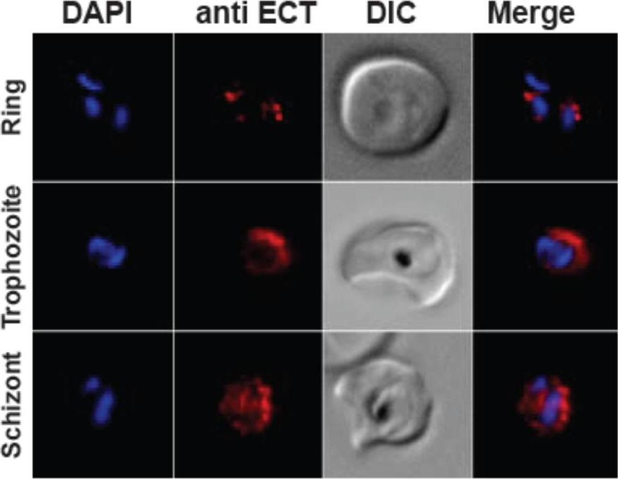 Cellular localization of ECT in Plasmodium falciparum. Immunoflurorescence assays were done on human blood cells infected by P. falciparum 3D7 strain and revealed by anti-PfECT (red). Nuclei were stained in blue with DAPI. Differential interference contrast (DIC) images and merges are presented. The signal of the PfECT anti-sera was detected at all parasite stages showing a diffuse and dotted pattern. These data suggested that PfECT is present in the cytoplasm.Maheshwari S, Lavigne M, Contet A, Alberge B, Pihan E, Kocken C, Wengelnik K, Douguet D, Vial H, Cerdan R. Biochemical characterization of Plasmodium falciparum CTP:phosphoethanolamine cytidylyltransferase shows that only one of the two cytidylyltransferase domains is active. Biochem J. 2012 450(1):159-67
