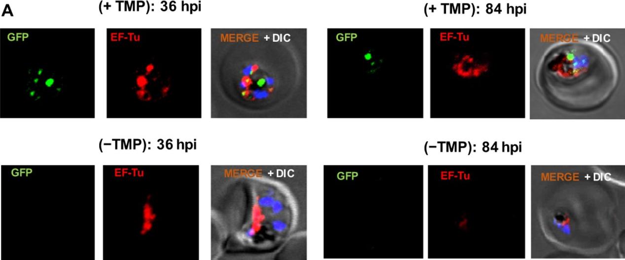 Down-regulation of PfOTU effects apicoplast development and segregation. (A) Fluorescent microscopy images of PfOTU-RFA parasites immuno-stained with anti- EF-Tu (red) antibodies at different developmental stages (ring, tropozoite and schizonts) during first and second growth cycle for +TMP and −TMP set. The growth and development of the apicoplast in the –TMP culture was indistinguishable from that of +TMP during the first cell cycle; the apicoplast showed elongated morphology in trophozoite stages, branched pattern in the early-schizont-stage parasites and divided normally. However, during the second cell cycle the growth and development of apicoplast was severely affected in −TMP set, the EF-Tu staining was observed to be faint and apicoplast was observed as a single punctate structure even in late stages.Datta G, Hossain ME, Asad M, Rathore S, Mohmmed A. Plasmodium falciparum OTU-like cysteine protease (PfOTU) is essential for apicoplast homeostasis and associates with non-canonical role of Atg8. Cell Microbiol. 2017 Apr 18. [Epub ahead of print]
