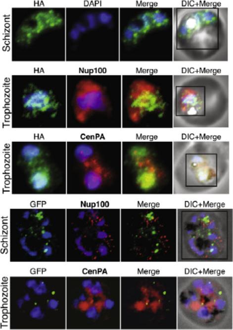 SET-domain proteins PF08_0012 and Histone-lysine N-methyltransferase PF13_0293 localize to the nuclear periphery marked by CenPA. (A) Localization of PF08_0012 reveals a clustered localization pattern present throughout the nuclear periphery of the cell. PF08_0012 is HA-tagged at the C-terminus and detected with anti-HA antibodies. (B) Live imaging of PF13_0293 shows localization to a distinct area in the nuclear periphery. Co-localization studies by immunofluorescence are shown. Nup100 (PFI0250c) and CenPA (histone H3 PF13_0185) are used as markers of the nuclear periphery.Volz J, Carvalho TG, Ralph SA, Gilson P, Thompson J, Tonkin CJ, Langer C, Crabb BS, Cowman AF. Potential epigenetic regulatory proteins localise to distinct nuclear sub-compartments in Plasmodium falciparum. Int J Parasitol. 2010 40:109-21. Copyright Elsevier 2010.