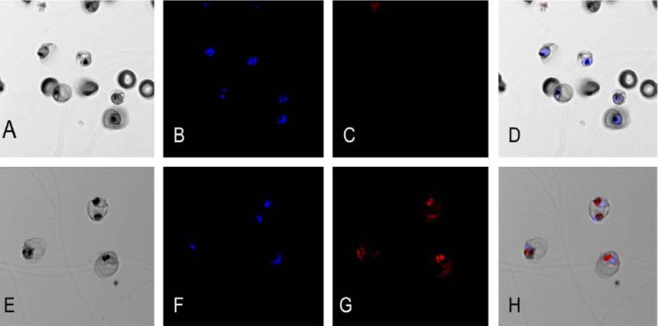Immunofluorescence assay using anti-PFI1140w and anti-PF13_0353 antisera. Purified P. falciparum trophozoites were incubated with a 1/500 dilution of antisera recognizing coding sequences of either PFI1140w or PF13_0353. Goat anti-mouse IgG conjugated with Alexa 633 was used as a secondary antibody. Nuclear DNA was labeled with Hoescht 33258. (A) DIC image of trophozoites treated with anti-PFI1140w antiserum (B) nuclear DNA stained with Hoescht 33258 and (C) negative Alexa 633 signal. (D) Merged images of (A–C). (E) DIC image of trophozoites treated with anti-PF13_0353 antiserum, (F) nuclear DNA stained with Hoescht 33258 and (G) Alexa 633 signal recognizing anti-PF13_0353 antibody. (H) Merged images of (E–G). PF13_0353 is localized in or in close proximity to the food vacuole.Ostera G, Tokumasu F, Oliveira F, Sa J, Furuya T, Teixeira C, Dvorak J. Plasmodium falciparum: food vacuole localization of nitric oxide-derived species in intraerythrocytic stages of the malaria parasite. Exp Parasitol. 2008 120:29-38.