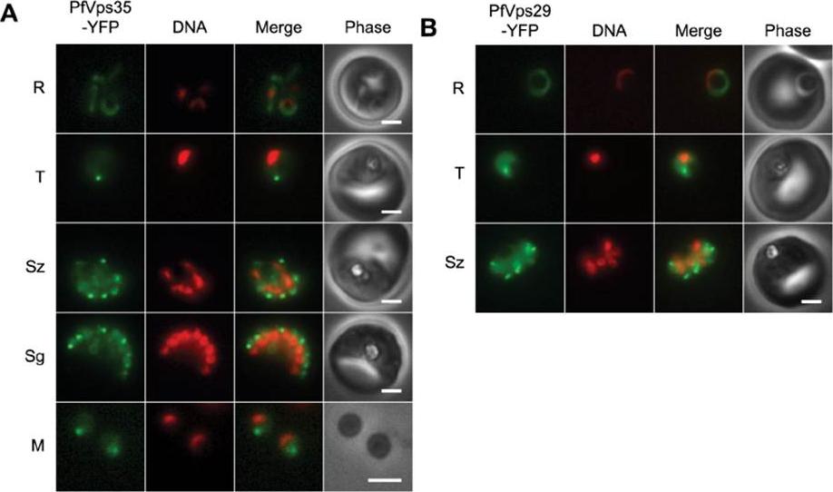 (A) Wide-field epifluorescence images of live parasites expressing PfVps35-YFP. Parasites are shown at ring (R), trophozoite (T), schizont (Sz), segmenter (Sg), and extracellular merozoite (M) stages. Hoechst 33342 fluorescence (DNA) is pseudocolored red. (B) Images of live parasites expressing PfVps29-YFP. Both PfVps29-YFP and PfVps35-YFP were expressed throughout the asexual blood stage. In live parasites expressing PfVps35-YFP, punctate structures were observed in trophozoites and schizonts amid a background of diffuse, presumably cytosolic fluorescence (A). As the parasites matured, the puncta became more numerous until in segmenting schizonts there appeared to be one retromer-labeled punctum for each daughter nucleus. Single puncta were present in egressed merozoites, which indicates that the retromer-labeled compartment is inherited. Surprisingly, the PfVps35-YFP-labeled puncta were no longer visible in early ring stage. The distribution of PfVps29-YFP across the asexual cycle was essentially identical to that of PfVps35-YFPKrai P, Dalal S, Klemba M. Evidence for a Golgi-to-Endosome Protein Sorting Pathway in Plasmodium falciparum. PLoS One. 2014 9(2):e89771.