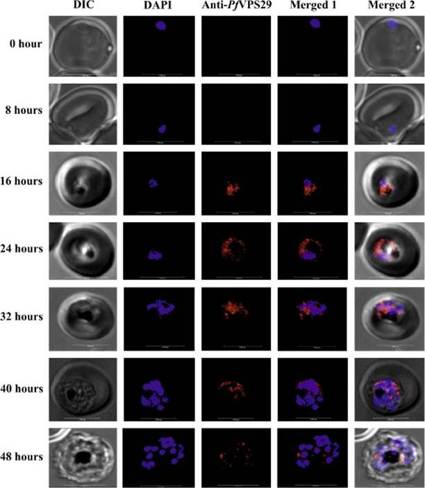 Localization of PfVPS29 in P. falciparum. Ring synchronized parasite (0 h) was grown in culture and at different time points of growth, iRBCs were processed and incubated with anti-PfVPS29 antibody followed by anti-rabbit Alexa fluor 647 (red fluorescence) and DAPI for nuclear staining (blue fluorescence). Each row is demonstrating a specific time point of growth from ring stage. Scale bar indicates 5 mm. PfVPS29 was located in the cytoplasm of the parasite. Although, PfVPS29 was clearly present from the trophozoite (16-32 h) up to the schizont (32-48 h) stage, its expression was observed maximally during the late trophozoite stage as evident from the fluorescent signal.Iqbal MS, Siddiqui AA, Alam A, Goyal M, Banerjee C, Sarkar S, Mazumder S, De R, Nag S, Saha SJ, Bandyopadhyay U. Expression, purification and characterization of Plasmodium falciparum vacuolar protein sorting 29. Protein Expr Purif. 2015 Dec 12. [Epub ahead of print]