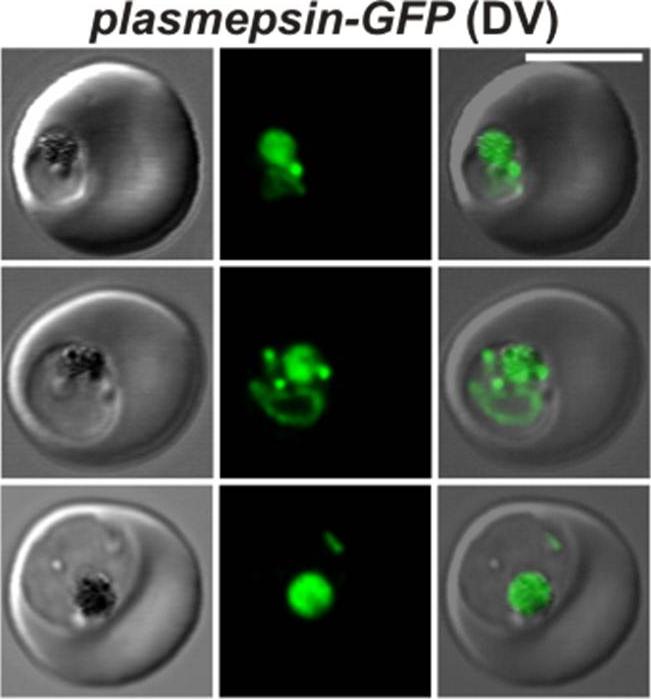 Confocal fluorescence microscopy images of transfected 3D7 P. falciparum-infected RBCs expressing a GFP chimera directed to the digestive vacuole. DIC image, the GFP fluorescence signal, and an overlay of a P. falciparum plasmepsin II-GFP transfectant. Scale bar = 5 µm. En route to the digestive vacuole during the ring and trophozoite stages plasmepsin-GFP is observed in the endoplasmic reticulum and in cytosome-derived vesicles (top and middle rows). In the late stages of parasite development, the chimera accumulates in the digestive vacuole as shown in the bottom row. Tilley L, McFadden G, Cowman A, Klonis N. Illuminating Plasmodium falciparum-infected red blood cells. Trends Parasitol. 2007 23:268-77. PMID: 17434344