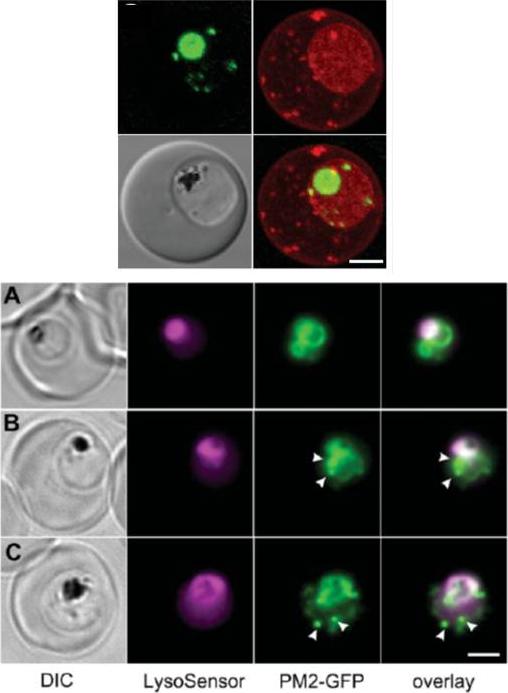 Upper panel: A 3D7-PM2 trophozoite was labelled with BODIPY® ceramide and the GFP (green fluorescence) and BODIPY® (red fluorescence) signals were imaged by confocal microscopy. The images shown represent an average projection obtained from a series of optical sections. BODIPY® ceramide labels the membrane rich parasite cytoplasm as well as punctate structures in the RBC cytosol that have previously been shown to be Maurer’s clefts and other membranous compartments. The cytostomal vesicles are visible as apparently independent structures in the parasite cytoplasm. Lower panel: Mixed-stage transfected parasites were incubated with the pH probe, LysoSensor Blue. Shown are bright field, LysoSensor Blue, GFP and merged GFP/LysoSensor Blue images. The LysoSensor Blue fluorescence is largely associated with the DV, while the GFP chimaera is also present in cytostomal vesicles (arrows) that do not stain with the LysoSensor Blue. Scale bar, 2 μm.Klonis N, Tan O, Jackson K, Goldberg D, Klemba M, Tilley L. Evaluation of pH during cytostomal endocytosis and vacuolar catabolism of haemoglobin in Plasmodium falciparum. Biochem J. 2007 407(3):343-54.