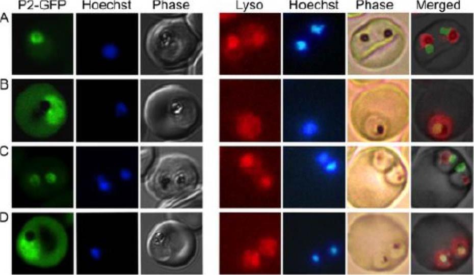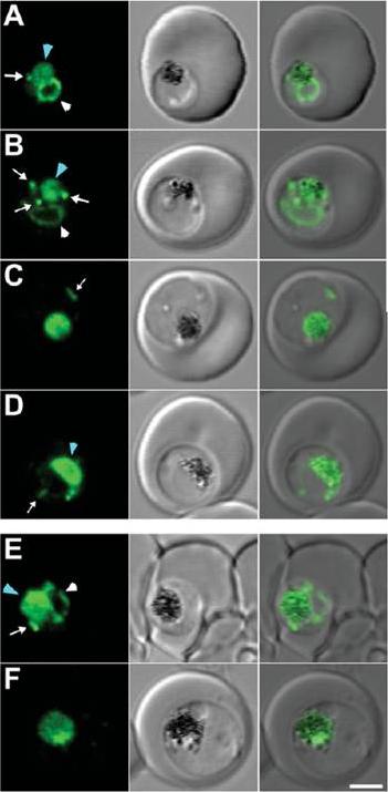 A trophozoite exhibiting GFP fluorescence in the food vacuole (arrowhead) and in a perinuclear ring (arrow). Fluorescence from the nuclear stain Hoechst 33342 is pseudocolored red. (B) A trophozoite with a fluorescent food vacuole (arrowhead) and a bright fluorescent spot (arrow) that lies at the periphery of the parasite. (C) A mature parasite displaying a large fluorescent food vacuole. Note the absence of fluorescence outside of the food vacuole. Bar, 2 mm.Klemba et al., 2004. Originally published in The Journal of Cell Biology. doi:10.1083/jcb200307147. Klemba M, Beatty W, Gluzman I, Goldberg DE. Trafficking of plasmepsin II to the food vacuole of the malaria parasite Plasmodium falciparum. J Cell Biol. 2004 Jan 5;164(1):47-56.