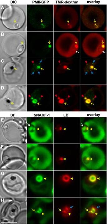 Identification of haemoglobinase-containing and LysoSensor-Blue labelled compartments in infected RBCs. The panels are DIC or bright-field images, GFP or SNARF-1 fluorescence (depicted in green) or TMR-dextran or LysoSensor Blue fluorescence (depicted in red), and overlays of the red and green images. (A-D) Plasmepsin-II-GFP-3D7 transfectants in TMR-dextran containing resealed RBCs. The pre-digestive vacuole (DV) and DV compartments (yellow arrows) and the extra-DV compartments (red arrowheads) contain both plasmepsin-II-GFP and TMR-dextran. Plasmepsin-II-GFP is also present in structures that could represent nascent cytostomal invaginations (blue arrows). There is no plasmepsin-II-GFP associated with a larger spherical profile structure (white arrow). (E-H) In rings (E,F) and trophozoites (G,H) in SNARF-1-dextran containing RBCs, LysoSensor Blue is associated with peripheral structures and the DV (arrowheads) and extra-DV structures (yellow arrows). The spherical structure in ring-stage parasites (A, white arrow) is not labeled. Some additional structures in the trophozoite-stage parasites are weakly labeled with LysoSensor Blue, but do not contain SNARF-1-dextran (H, blue arrow). Scale bars: 5 mm. Abu Bakar N, Klonis N, Hanssen E, Chan C, Tilley L. Digestive-vacuole genesis and endocytic processes in the early intraerythrocytic stages of Plasmodium falciparum. J Cell Sci. 2010 123:441-450.