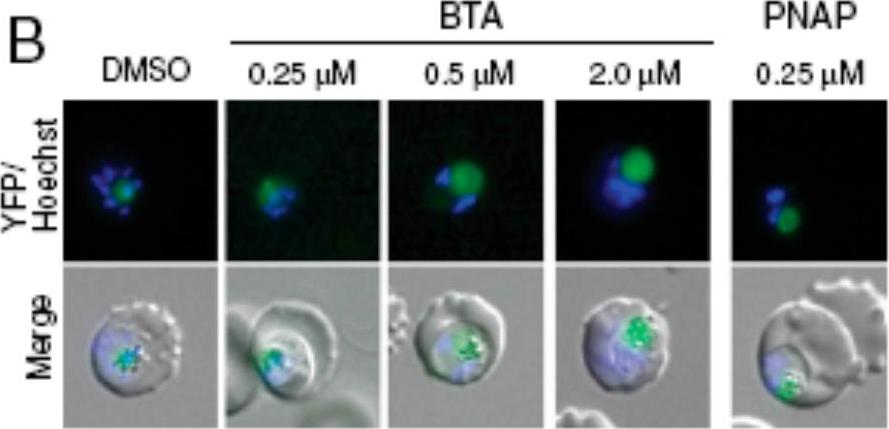 Digestive vacuole (DV) swelling was confirmed by the dose-dependent enlargement of the average DV area. Parasites expressing YFP-tagged plasmepsin II (PMII-YFP), which localizes to the DV, were treated with increasing concentrations of (Benzyl)Tyr-Ala (BTA) and 250 nM Phe-Naphthyl (PNAP) and imaged by fluorescence microscopy. Harbut MB, Velmourougane G, Dalal S, Reiss G, Whisstock JC, Onder O, Brisson D, McGowan S, Klemba M, Greenbaum DC. Bestatin-based chemical biology strategy reveals distinct roles for malaria M1- and M17-family aminopeptidases. Proc Natl Acad Sci U S A. 2011 108:E526-34.