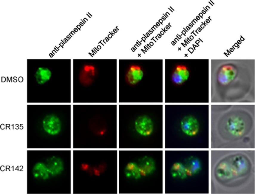 Representative IFA images show food vacuole morphology in parasites treated with vehicle, CR135, and CR142, individually. Anti-Plasmepsin II polyclonal antibody (rabbit) was diluted 1:1000 and an AlexaFluor 488 conjugated anti-rabbit secondary antibody was diluted 1:350. MitoTracker Red stains active mitochondria. Under drug treatment (CR135 or CR142), the globular structure of the food vacuole of a normal parasite was absent, and the vacuole marker Plasmepsin II distributed among many punctate particles scattered throughout the parasite cytosol.Ke H, Morrisey JM, Qu S, Chantarasriwong O, Mather MW, Theodorakis EA, Vaidya AB. Caged Garcinia xanthones: a novel chemical scaffold with potent antimalarial activity. Antimicrob Agents Chemother. 2016 Oct 31. pii: AAC.01220-16PMID: