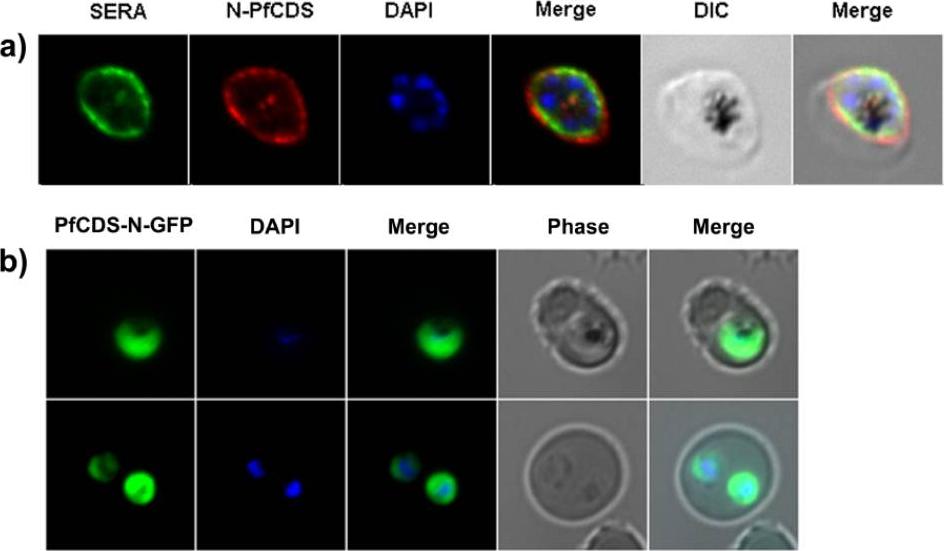 Localization of the N-terminal extension of Plasmodium falciparum cytidine diphosphate diacylglycerole synthase (PfCDS). (A) Co-localization studies by immunofluorescence assay (a) The native N-terminal extension of PfCDS is labeled in red with antiserum N26 and SERA protein, a parasitophorous vacuole marker, is labeled in green. (b) Live GFP fluorescence of the N-terminal extension of PfCDS fused to GFP (PfCDS-N-GFP). Nuclei were stained in blue with DAPI. Differential interference contrast (DIC) and merged images are shown. Shastri S, Zeeman AM, Berry L, Verburgh RJ, Braun-Breton C, Thomas AW, Gannoun-Zaki L, Kocken CH, Vial HJ. Plasmodium CDP-DAG synthase: An atypical gene with an essential N-terminal extension. Int J Parasitol. 2010 40:1257-1268. Copyright Elsevier 2010.