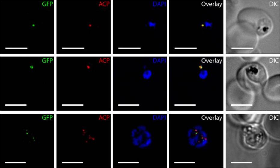 PfPrex primase traffics to the apicoplast and forms two foci during the intraerythrocytic cycle. The complete primase domain (AA1–465) of PfPrex was genetically fused to GFPmut2 and expressed from a nuclear plasmid in P. falciparum NF54 parasites. Indirect immunofluorescence microscopy with DAPI and antibodies against GFP and PfACP demonstrates clear apicoplast localization of PfPrex throughout the intraerythrocytic cycle. Differential interference contrast (DIC) images show typical appearances of both the parasite and the host RBC. Two foci appear within the apicoplast during the early trophozoite stage and then segregate to daughter merozoites during schizogony. Scale bar is 5 mm.Lindner SE, Llinás M, Keck JL, Kappe SH. The primase domain of PfPrex is a proteolytically matured, essential enzyme of the apicoplast. Mol Biochem Parasitol. 2011 180(2):69-75