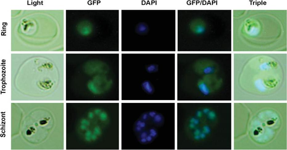 Localization of GFP–PfPRMT1. Representative images of GFP–PfPRMT1 in a ring-, trophozoite-, and schizont-stage parasite. Nuclei were stained with DAPI. ‘Triple’ indicates merging of the light, GFP and DAPI images of the same cells. PfPRMT1 is located in both the cytoplasm and the nucleus.Reproduced with permission, from Fan Q, Miao J, Cui L, Cui L. Characterization of protein arginine methyltransferase I from Plasmodium falciparum. Biochem J. 2009 421(1):107-18. © The Biochemical Society.