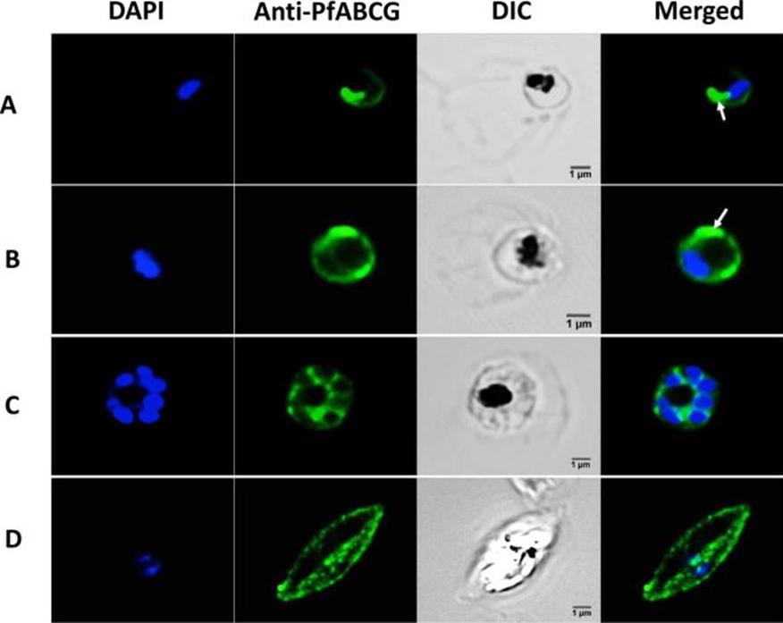 Confocal microscopy of plasmodium stages immuno-stained with PfABCG antiserum. Immuno-histochemical staining of 3D7 cultured parasites with PfABCG antiserum. Columns 1-3 show PfABCG immuno-histochemical staining resolved with Alexa-fluor 488-labeled goat anti-rabbit secondary antibody (Green), counterstaining of nuclear DNA with DAPI (Blue), and differential interference contrast of infected erythrocyte, respectively. Rows A-D show early trophozoites, late trophozoites schizonts and female gametocyte stage V stained with PfABCG antiserum, respectively. Column 4 shows the merge of column 1 and 2, without Differential Interference Contrast (DIC). White arrowheads indicate the intensely stained structures beneath the parasite's plasma membrane.Edaye S, Georges E. Characterization of native PfABCG protein in Plasmodium falciparum. Biochem Pharmacol. 2015 Jul 31. [Epub ahead of print]