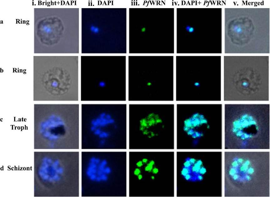 Localization of PfWrn in different intraerythrocytic stages of P. falciparum by immunofluorescence staining and confocal microscopy. The cells were fixed and immunostained with purified primary antibodies against PfWrn followed by fluoroisothiocyanatel abeled secondary antibody and then counterstained with DAPI. In each panel, single confocal image of each stage is shown. a, b Ring stage, c trophozoite stage, and d schizont stage. In each panel, i phase contrast image, ii image of cell stained with DAPI (blue), iii immunofluorescently stained cell (green), iv superimposed image, and v merged. Wrn protein expresses and localizes mainly in the nuclear region.Rahman F, Tarique M, Ahmad M, Tuteja R. Plasmodium falciparum Werner homologue is a nuclear protein and its biochemical activities reside in the N-terminal region. Protoplasma. 2015 Apr 1. [Epub ahead of print]