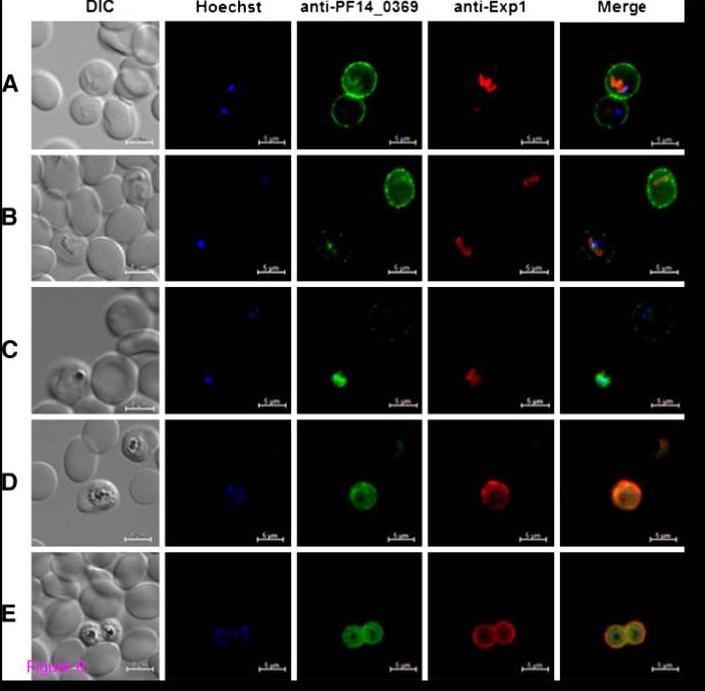 Immunolocalization of a putative P. falciparum copper transport protein. Asexual P. falciparum parasites were grown in vitro, synchronized by sorbitol treatment and samples removed at five time points (A – E). Fixed parasites were probed with chicken antipeptide antibodies targeting PF14_0369 and rabbit antibodies against Exp-1. Chicken antibodies were detected with a Cy3-conjugated antibody and rabbit antibodies with a Cy2-conjugated antibody. Panels are representative of the following stages of asexual parasite development: A. early rings; B. late rings; C. early trophozoites; D. late trophozoites; E. schizonts. Parasite DNA was stained with Hoechst. Scale bar is 5 μm.Choveaux DL, Przyborski JM, Goldring JD. A Plasmodium falciparum copper-binding membrane protein with copper transport motifs. Malar J. 2012 11(1):397.
