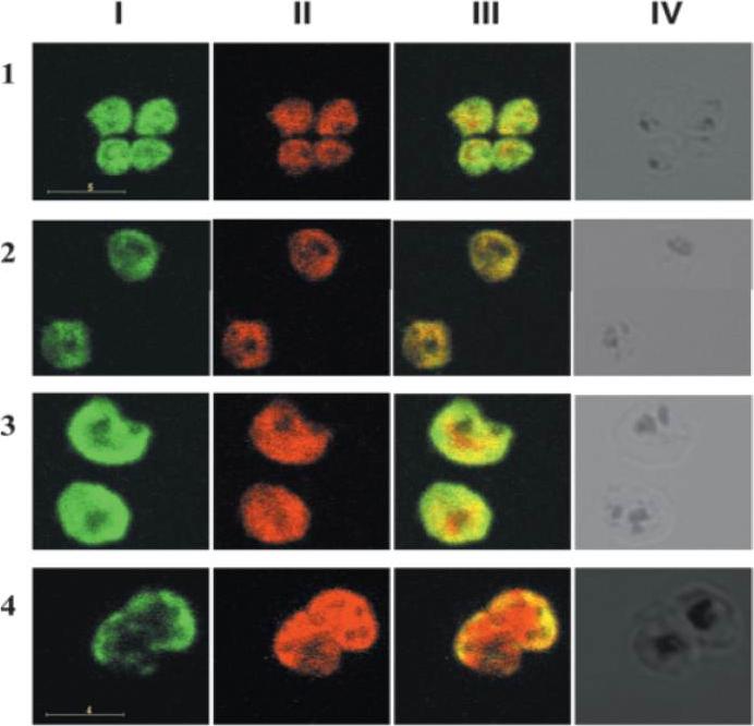 IFA of merozoites stained with a mAb specific for pfGAPDH, pfAldolase and RAP-1. Row 1 demonstrates merozoites stained with anti-pfGAPDH mAb (green, column I), anti-pfAldolase mAb (red, column II) and the overlay of both images (column III). Row 2 shows merozoites stained with anti-pfGAPDH mAb (green, column I) and anti-RAP-1 mAb 5-2 (red, column II) and the overlay of both images (column III). pfAldolase and pfGAPDH were colocalized in the early stages of parasite development since both, the green and the red signals, were super-imposed resulting in orange signals. At 40 h post synchronization the green signal of the anti-pfGAPDH staining was largely confined to the periphery of the schizont, while the red signal of the anti-pfAldolase staining remained distributed equally throughout the schizont. pfGAPDH and pfAldolase were preferentially localized at opposite cell poles. pfGAPDH was preferentially co-localized with RAP-1 which is associated with the apical complex of the merozoites.Daubenberger CA, Tisdale EJ, Curcic M, Diaz D, Silvie O, Mazier D, Eling W, Bohrmann B, Matile H, Pluschke G. The N'-terminal domain of glyceraldehyde-3-phosphate dehydrogenase of the apicomplexan Plasmodium falciparum mediates GTPase Rab2-dependent recruitment to membranes. Biol Chem. 2003 384:1227-37. Copyright Walter de Gruyter GmbH 2009