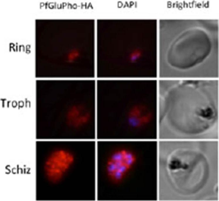Immunodetection of the HA-tagged PfGluPho. Immunofluorescence shows a cytoplasmic localisation of the PfGluPho-HA with antiserum against the haemagglutinin (HA) antibody, consistent with bioinformatic analysis of the enzyme and its surrounding pathway. Labelling is excluded from the digestive vacuole, but some overlap is observed with the DAPI-stained nucleus. Representative parasites are shown from ~18 hour old Ring stages (ring), ~30 hour old trophozoite stages (Troph) and ~42 hour old schizont stages (Schiz).Allen SM, Lim EE, Jortzik E, Preuss J, Chua HH, MacRae JI, Rahlfs S, Haeussler K, Downton MT, McConville MJ, Becker K, Ralph SA. Plasmodium falciparum glucose-6-phosphate dehydrogenase 6-phosphoglucono-lactonase is a potential drug target. FEBS J. 2015 Jul 21. [Epub ahead of print] PMID: .