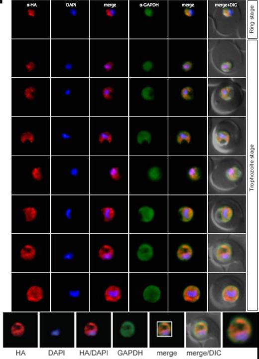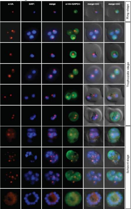Localisation of PF13_0042 during the IDC. Localisation of the tagged protein was visualised using anti-HA antibodies (red). Antibodies against GAPDH were used to visualise the cytosolic compartment. DAPI was used to visualise the nucleus. DIC images are shown as reference. The protein is associated with the nucleus.Oehring SC, Woodcroft BJ, Moes S, Wetzel J, Dietz O, Pulfer A, Dekiwadia C, Maeser P, Flueck C, Witmer K, Brancucci NM, Niederwieser I, Jenoe P, Ralph SA, Voss TS. Organellar proteomics reveals hundreds of novel nuclear proteins in the malaria parasite Plasmodium falciparum. Genome Biol. 2012 Nov 26;13(11):R108.