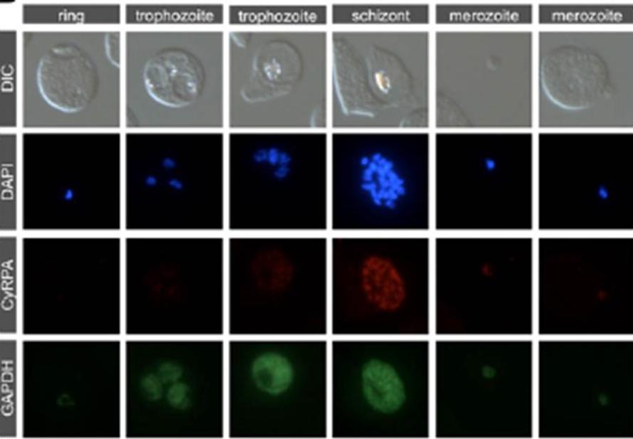 Stage-specific expression of CyRPA in late asexual blood-stage parasites. Indirect immunofluorescence stainings of asexual bloodstage parasites confirmed stage-specific expression in schizont stages and free merozoites. Methanol/acetone fixed P. falciparum 3D7 parasites were probed with anti-CyRPA mAb c06 (red) and anti-GAPDH mAb (green). Exposure times were identical for all pictures of the same channel. Nuclei were stained with DAPI (blue). Original magnification x1008.Dreyer AM, Matile H, Papastogiannidis P, Kamber J, Favuzza P, Voss TS, Wittlin S, Pluschke G. Passive immunoprotection of Plasmodium falciparum-infected mice designates the CyRPA as candidate malaria vaccine antigen. J Immunol. 2012 188(12):6225-37.