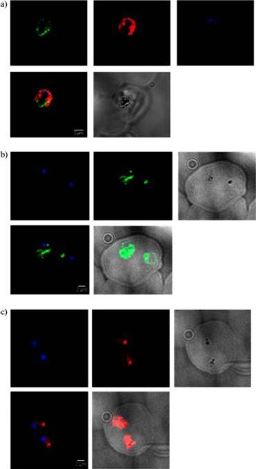 IFA of merozoites stained with a mAb specific for pfGAPDH, pfAldolase and RAP-1. Row 1 demonstrates merozoites stained with anti-pfGAPDH mAb (green, column I), anti-pfAldolase mAb (red, column II) and the overlay of both images (column III). Row 2 shows merozoites stained with anti-pfGAPDH mAb (green, column I) and anti-RAP-1 mAb 5-2 (red, column II) and the overlay of both images (column III). pfAldolase and pfGAPDH were colocalized in the early stages of parasite development since both, the green and the red signals, were super-imposed resulting in orange signals. At 40 h post synchronization the green signal of the anti-pfGAPDH staining was largely confined to the periphery of the schizont, while the red signal of the anti-pfAldolase staining remained distributed equally throughout the schizont. pfGAPDH and pfAldolase were preferentially localized at opposite cell poles. pfGAPDH was preferentially co-localized with RAP-1 which is associated with the apical complex of the merozoites.Daubenberger CA, Tisdale EJ, Curcic M, Diaz D, Silvie O, Mazier D, Eling W, Bohrmann B, Matile H, Pluschke G. The N'-terminal domain of glyceraldehyde-3-phosphate dehydrogenase of the apicomplexan Plasmodium falciparum mediates GTPase Rab2-dependent recruitment to membranes. Biol Chem. 2003 384:1227-37. Copyright Walter de Gruyter GmbH 2009