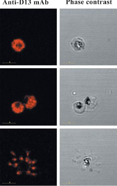 Immunofluorescence analysis of schizonts, segmenter, and released merozoites of P. falciparum using anti-D13 MAb DD1.1 and confocal microscopy. In column I, staining with MAb DD1.1 is shown, while in column II the phase contrast of the corresponding parasites is presented. Specific staining of schizonts (first row), segmenters (second row) and released merozoites (third row) are presented. Interestingly, in the merozoite stage, D13 protein seemed to be concentrated in a distinct area of the cell, while during schizont stages the protein was more evenly distributed in the parasite.Daubenberger CA, Diaz D, Curcic M, Mueller MS, Spielmann T, Certa U, Lipp J, Pluschke G. Identification and characterization of a conserved, stage-specific gene product of Plasmodium falciparum recognized by parasite growth inhibitory antibodies. Infect Immun. 2003 71(4):2173-81.