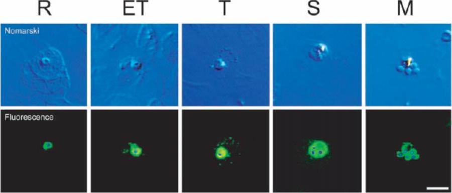 Change in the distribution of PfNSF during development. Parasitized erythrocytes at various stages as indicated were doubly labeled with antibodies against NSF and 49,6-diamidino-2-phenylindole HCl and observed under a Nomarski microscope (upper panel) and a fluorescence microscope (lower panel). After superpositioning the two images, the localization of PfNSF (green) and nuclei (blue) is shown. R, ring; ET, early trophozoite; T, trophozoite; S, schizont; M, merozoite. Bar, 5 mm. A similar degree of anti-PfNSF immunoreactivity was observed in all stages of intraerythrocyte parasites, indicating that PfNSF is expressed in all cell stages. At the early trophozoite stage, PfNSF appeared in the extraparasite space and seemed to be associated with several apparent vesicular structures outside the parasites in the erythrocyte cytoplasm. At the trophozoite stage, the PfNSF-positive vesicular structure seems to be more discrete and distributed throughout erythrocyte cytoplasm, which becomes weak at the schizont stage and disappears at the merozoite stage. These results indicate that export of PfNSF occurs at the early trophozoite stage.Hayashi M, Taniguchi S, Ishizuka Y, Kim HS, Wataya Y, Yamamoto A, Moriyama Y. A homologue of N-ethylmaleimide-sensitive factor in the malaria parasite Plasmodium falciparum is exported and localized in vesicular structures in the cytoplasm of infected erythrocytes in the brefeldin A-sensitive pathway. J Biol Chem. 2001 276:15249-55.
