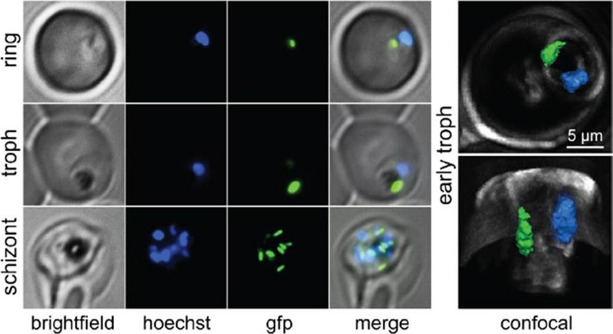Localization of GFP in the D10 ACPL-GFP strain was used to visualize the apicoplast. As expected, GFP localizes to a discrete structure in the parasite Widefield epifluorescence microscopy for apicoplast (ACPL-GFP) and nucleus (Hoescht 33342) comparing ring, trophozoite, and schizont.Yeh E, Derisi JL. Chemical Rescue of Malaria Parasites Lacking an Apicoplast Defines Organelle Function in Blood-Stage Plasmodium falciparum. PLoS Biol. 2011 9(8):e1001138.