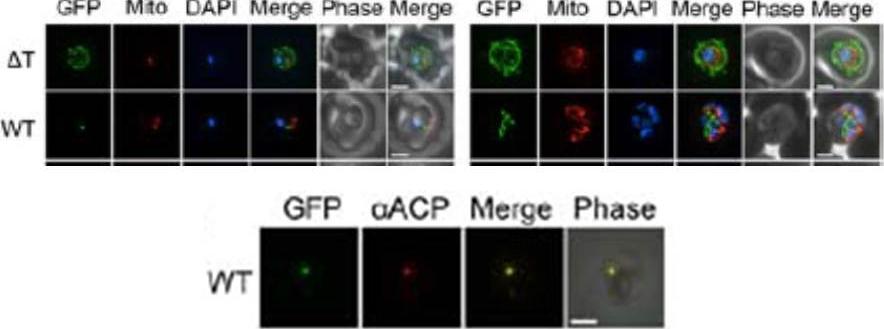 Upper panel: Epifluorescent images of live P. falciparum erythrocytic stage parasites. The parasites were stained with mitotracker to identify the mitochondrion and DAPI to identify the nucleus. GFP fluorescence in the ΔT construct (ΔT’, was generated by mimicking a previously described construct in which the TP was deleted) is associated with the parasite periphery and compartments in the erythrocyte cytosol. For the wild type (WT) construct in ring and early trophozoite stage parasites show point-like GFP fluorescence as expected for apicoplast localization. Late trophozoite stage parasites show a branched structure labeled by GFP which is distinct from the mitochondria, consistent with apicoplast localization. Image Z-stacks were deconvoluted and then presented as a single combined image. Scale bar = 2μm.Lower panel: Colocalization of GFP constructs with endogenous ACP. αACP antibodies were affinity purified with the mature ACP domain to avoid cross-reactivity with the TP of ACP used in GFP. GFP fluorescence was found to colocalize with αACP antibodies, demonstrating apicoplast localization. Scale bar = 2μm.Gallagher JR, Matthews KA, Prigge ST. P. falciparum apicoplast transit peptides are unstructured in vitro and during apicoplast import. Traffic. 2011 12(9):1124-38