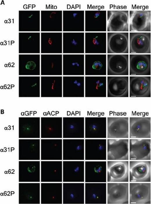 Subcellular location, processing and genomic integration of helix stabilization. Constructs Epifluorescent images of live P. falciparum erythrocytic-stage parasites expressing GFP fused to helix stabilization mutants of the ACP leader peptide. The parasites were stained with mitotracker to identify mitochondria and DAPI to identify nuclei. Image z-stacks were deconvoluted and then presented as a single combined image. Scale bar = 2 μm. B) Colocalization of GFP constructs with endogenous ACP. An antibody specific for GFP was found to colocalize with aACP antibodies, demonstrating apicoplast localization for all constructs except for a62. DAPI stains the nuclei. Scale bar = 2 μm. Any observed changes in localization are due to the stabilized helical structure, a single proline mutation was introduced into each of the engineered TPs at residue 30, producing the α31P and a62P constructs. The L30P mutation reduces the predicted average helical content for the a 31P and a62P constructs to 3% and 8%, respectively. GFP fluorescence of the a62P constructs was observed around the periphery of the parasite, consistent with accumulation in the parasitophorous vacuole, as observed for the ΔT construct. the helix-stabilizing mutations in a62 prevented this construct from localizing to the apicoplast.Gallagher JR, Matthews KA, Prigge ST. Plasmodium falciparum apicoplast transit peptides are unstructured in vitro and during apicoplast import. Traffic. 2011 12(9):1124-38.