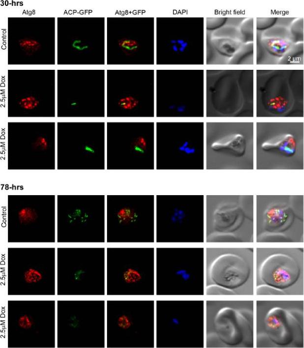 Atg8 in doxycycline-treated parasites. Synchronized ring stage P. falciparum D10 parasites expressing the apicoplast marker ACP-GFP were cultured in the presence of DMSO (Control) or doxycycline (2.5 mM Dox) for two full cycles, samples were collected at 30-hours (30-hrs) and 78-hours (70-hrs) time points, and processed for IFA using anti-Atg8 antibodies. The parasite images indicate that both control and treated parasites have strong signal over the elongated apicoplast at the 30-hours time point, indicating a healthy dividing apicoplast. The 78-hours control parasite have multiple intensely-stained apicoplasts, indicating that it has matured to multinucleate stage and the apicoplast has divided, whereas the treated parasites have weak fragmented signal, suggesting disruption of the apicoplast. Note that Atg8 signal pattern in the control and treated parasites mostly remains unchanged.Navale R, Atul, Allanki AD, Sijwali PS. Characterization of the Autophagy Marker Protein Atg8 Reveals Atypical Features of Autophagy in Plasmodium falciparum. PLoS One. 2014 Nov 26;9(11):e113220